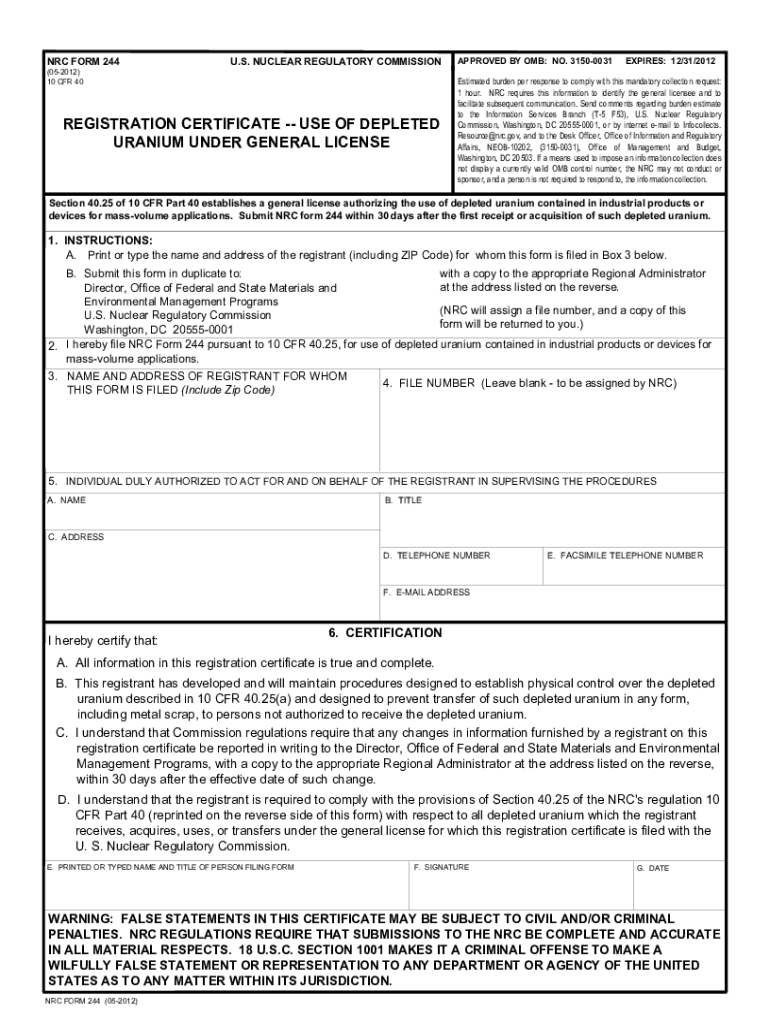 10 CFR 40U. S. NUCLEAR REGULATORY COMMISSIONREGISTRATION CERTIFICATE USE OF DEPLETED