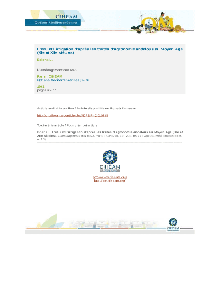 L\'eau et l\'irrigation d\'aprs les traits d\'agronomie andalous au Moyen Age