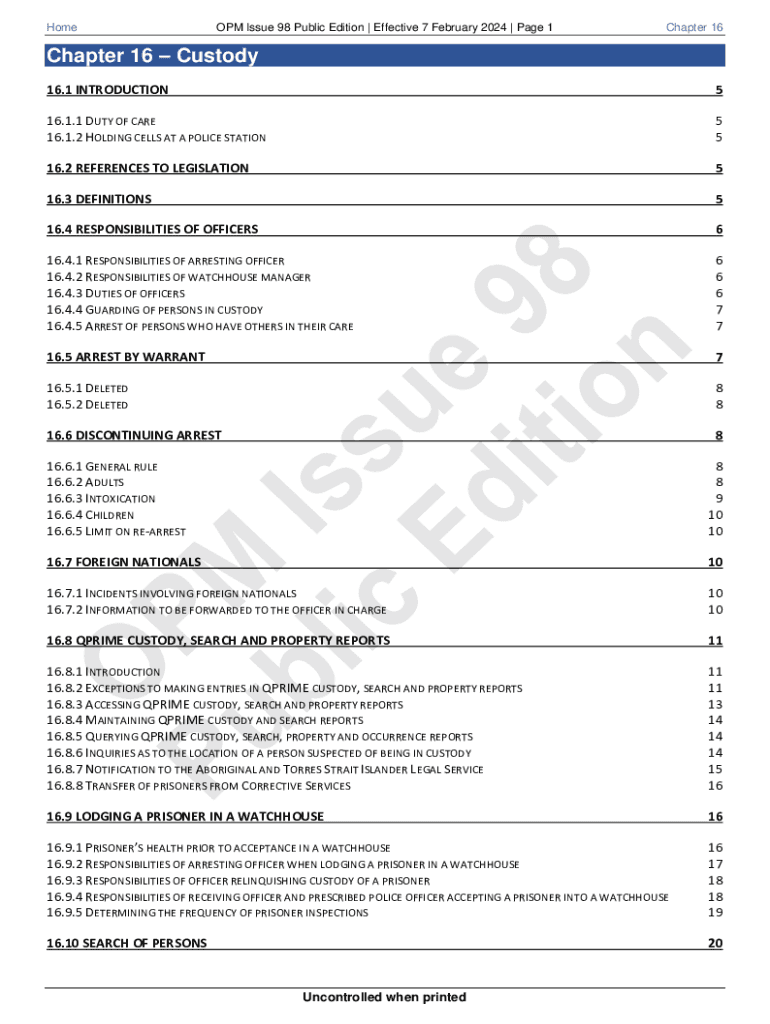 HomeOPM Issue 98 Public Edition | Effective 7 February 2024 | Page 1Chapter 16Chapter 16 Custody 16.1 INTRODUCTION516.1.1 DUTY OF CARE 16.1.2 HOLDING CELLS AT A POLICE STATION5 516.2 REFERENCES TO