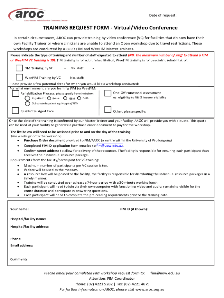 Date of request:TRAINING REQUEST FORM Virtual/Video Conference In certain circumstances, AROC can provide training by video conference (VC) for facilities that do now have their own Facility Trainer