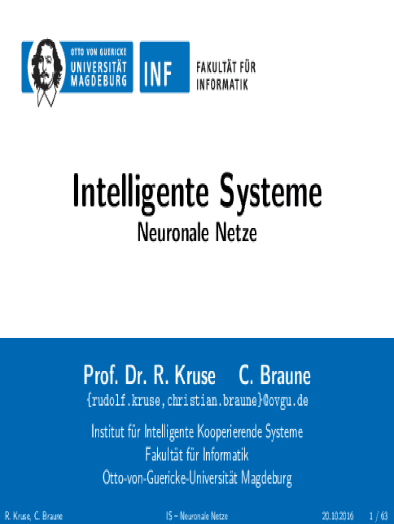 Intelligente Systeme Neuronale NetzeProf. Dr. R. KruseC. Braunerudolf.kruse,christian.braune@ovgu.de Institut fr Intelligente Kooperierende Systeme Fakultt fr Informatik OttovonGuerickeUniversitt