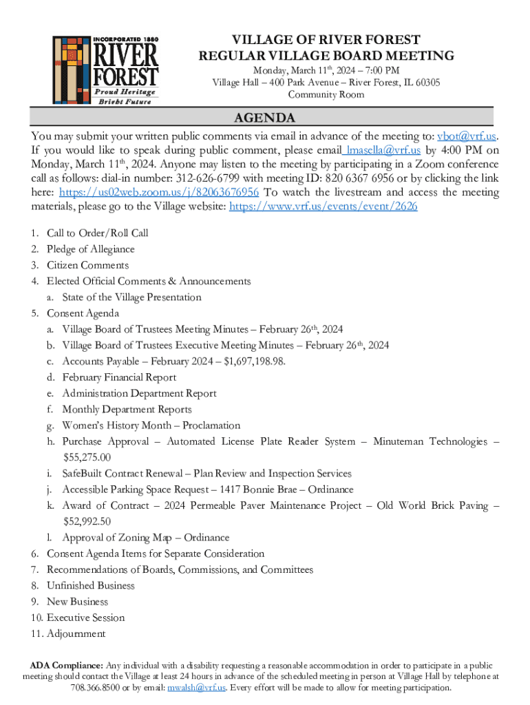 VILLAGE OF RIVER FOREST REGULAR VILLAGE BOARD MEETING Monday, March 11th, 2024 7:00 PM Village Hall 400 Park Avenue River Forest, IL 60305 Community RoomAGENDAYou may submit your written public comments