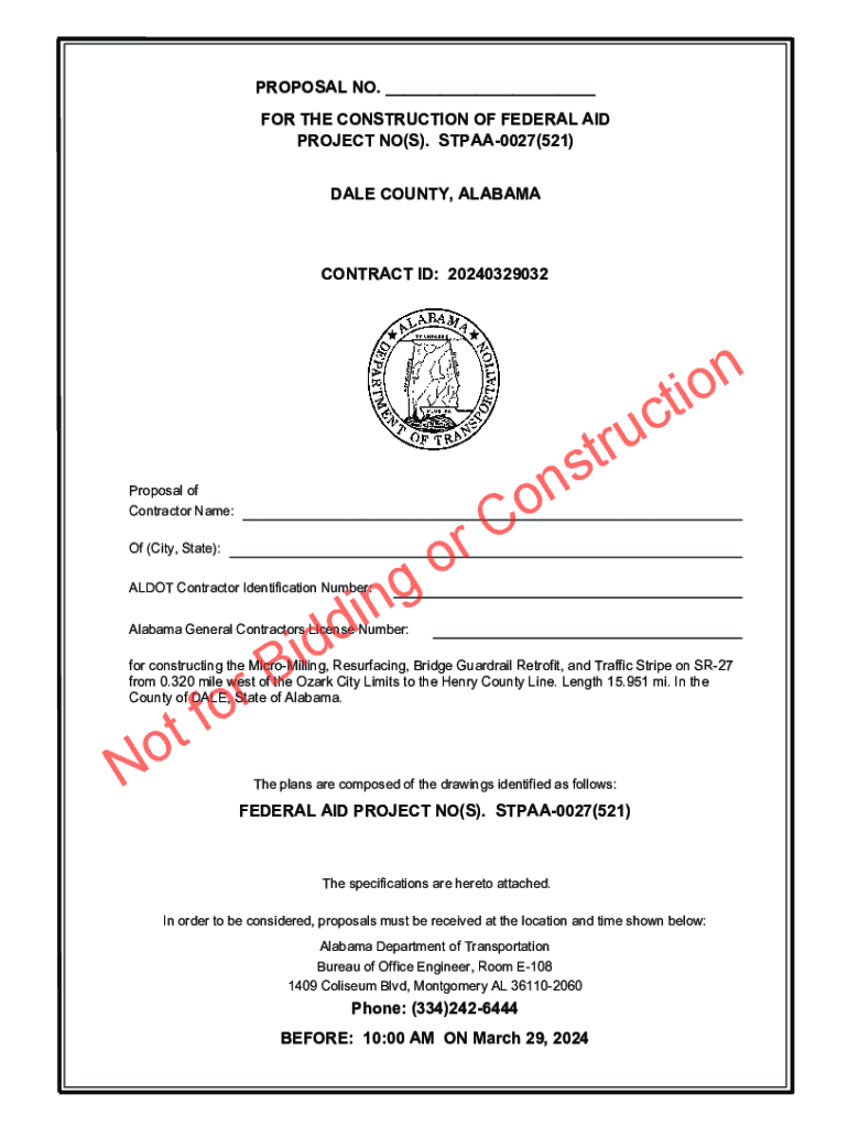 PROPOSAL NO. ___ FOR THE CONSTRUCTION OF FEDERAL AID PROJECT NO(S). STPAA0027(521) DALE COUNTY, ALABAMACONTRACT ID: 20240329032Proposal of Contractor Name:r o gOf (City, State):n o i t c u rt s no