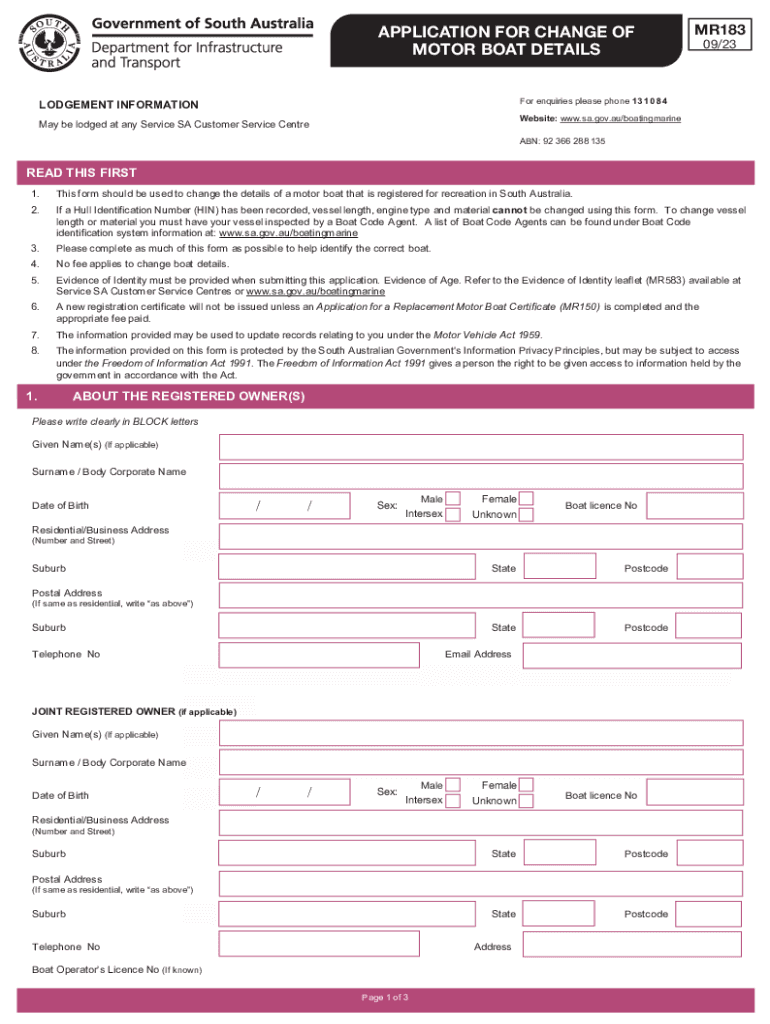 09/23For inquiries please phone 13 10 84LODGEMENT INFORMATIONWebsite: www.sa.gov.au/boatingmarineMay be lodged at any Service SA Customer Service Central: