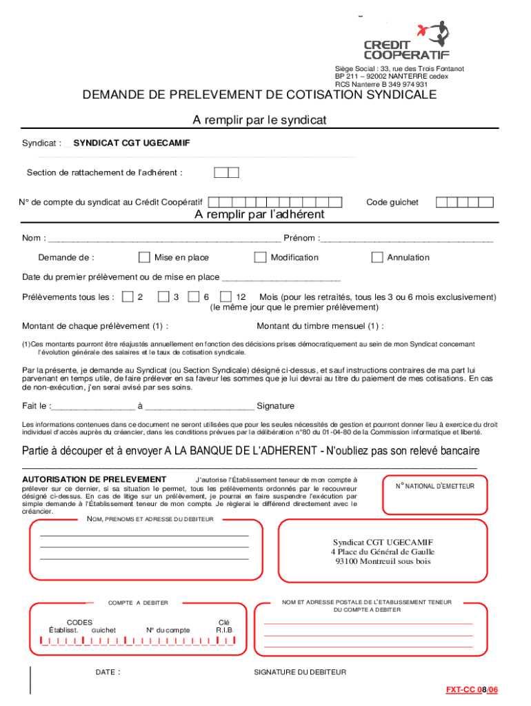 Sige Social : 33, rue des Trois Fontanot BP 211 92002 NANTERRE cedex RCS Nanterre B 349 974 931DEMANDE DE PRELEVEMENT DE COTISATION SYNDICALE A remplir par le syndicat Syndicat : __SYNDICAT CGT UGECAMIF