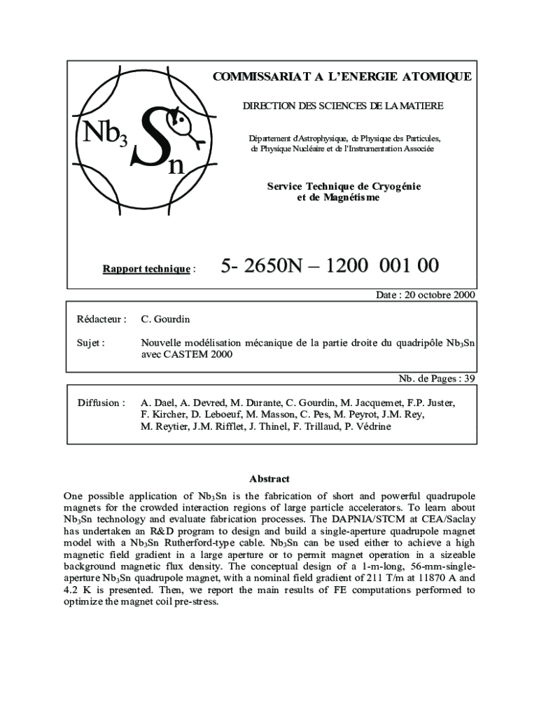 COMMISSARIAT A ENERGIES ATOMIQUENb3SnRapport technique :DIRECTION DES SCIENCES DE LA MATTER