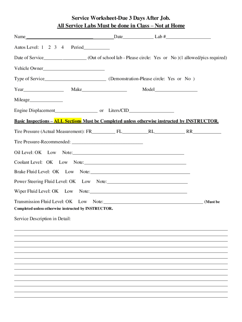 Service WorksheetDue 3 Days After Job. All Service Labs Must be done in Class Not at Home Name ___ Autos Level: 12 34Date___ Lab #___Period___Date of Service___ (Out of school lab Please circle: Yes