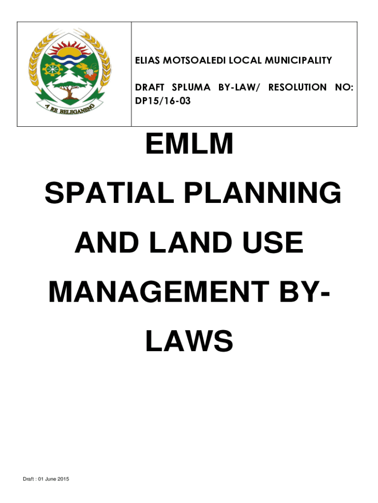 ELIAS MOTSOALEDI LOCAL MUNICIPALITY DRAFT SPLUMA BYLAW/ RESOLUTION NO: DP15/1603EMLM SPATIAL PLANNING AND LAND USE MANAGEMENT BYLAWSDraft : 01 June 2015ARRANGEMENT OF SECTIONS CHAPTER 1 DEFINITIONS,