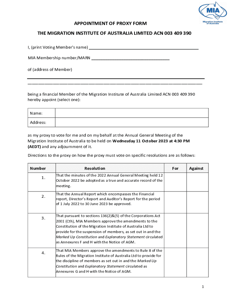APPOINTMENT OF PROXY FORM THE MIGRATION INSTITUTE OF AUSTRALIA LIMITED ACN 003 409 390 I, (print Voting Member\'s name) MIA Membership number/MARN ___ of (address of Member) ___being a financial Member
