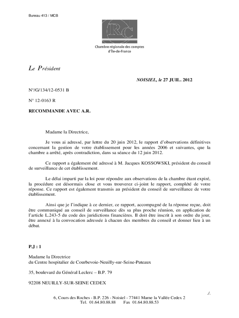 Bureau 413 / MCBLe Prsident NOISIEL, le 27 JUIL. 2012 N/G/134/120531 B N 120163 R RECOMMANDE AVEC A.R.Madame la Directrice, Je vous ai adress, par lettre du 20 juin 2012, le rapport dobservations