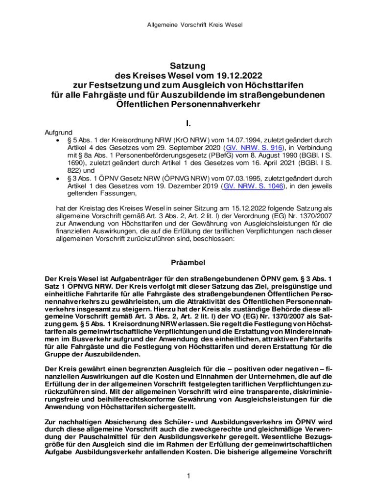Allgemeine Vorschrift Kreis WeselSatzung des Kreises Wesel vom 19.12.2022 zur Festsetzung und zum Ausgleich von Hchsttarifen fr alle Fahrgste und fr Auszubildende im straengebundenen ffentlichen Personennahverkehr
