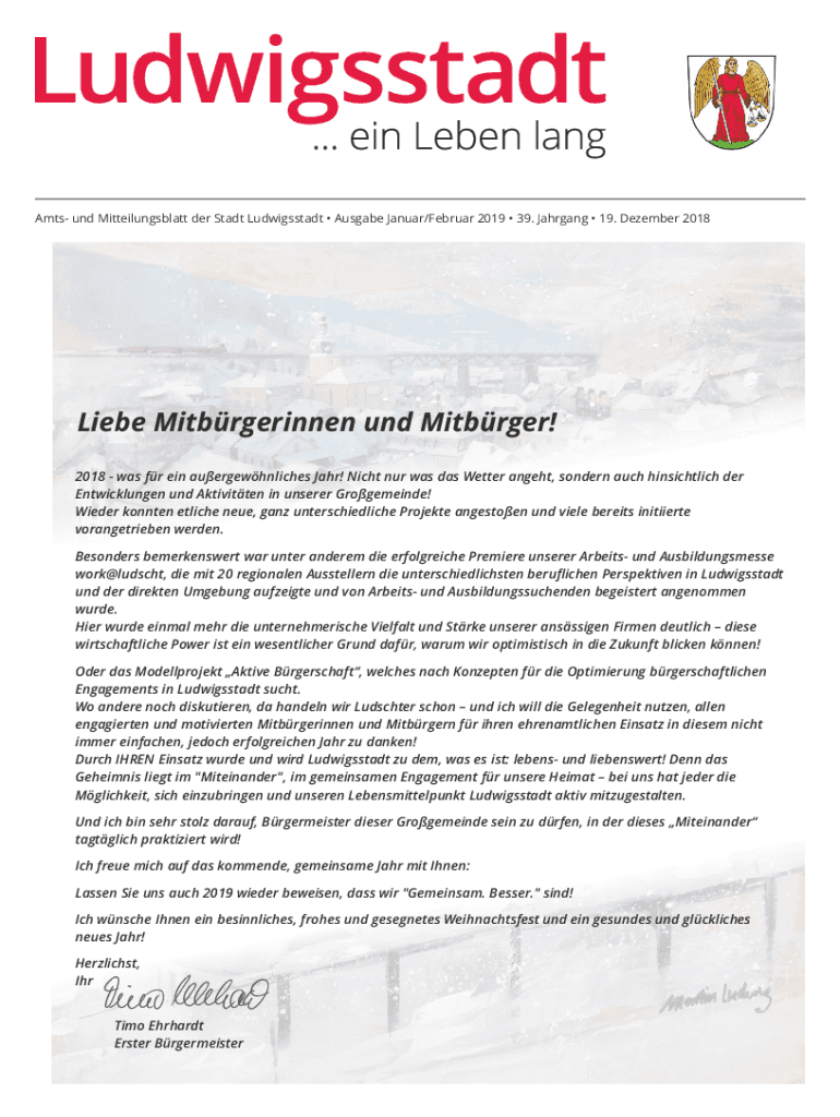 Amts und Mitteilungsblatt der Stadt Ludwigsstadt Ausgabe Januar/Februar 2019 39. Jahrgang 19. Dezember 2018Liebe Mitbrgerinnen und Mitbrger! 2018 was fr ein auergewhnliches Jahr! Nicht nur was das