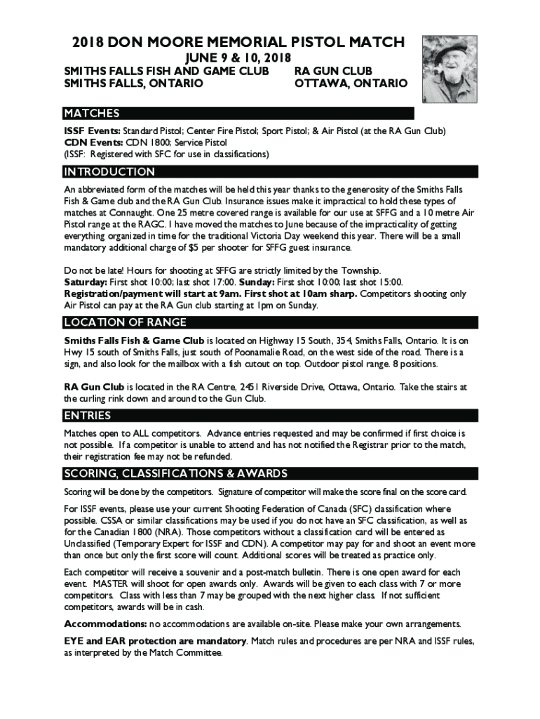 2018 DON MOORE MEMORIAL PISTOL MATCH JUNE 9 & 10, 2018SMITHS FALLS FISH AND GAME CLUB SMITHS FALLS, ONTARIORA GUN CLUB OTTAWA, ONTARIOMATCHES ISSF Events: Standard Pistol; Center Fire Pistol; Sport