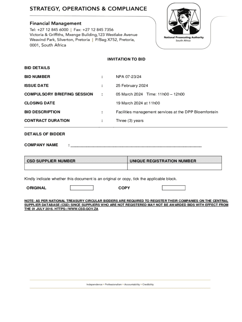Bid No: NPA 0723/24 Prepared by Supply Chain Management Unit Description: Facilities management services at the DPP Bloemfontein for a period of three (3) years.INVITATION TO BID BID DETAILS BID NUMBER:NPA