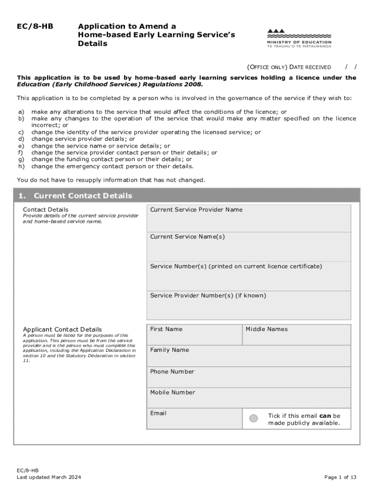 EC/8HBApplication to Amend a Homebased Early Learning Services Details (OFFICE ONLY) DATE RECEIVED/ /This application is to be used by homebased early learning services holding a licence under the