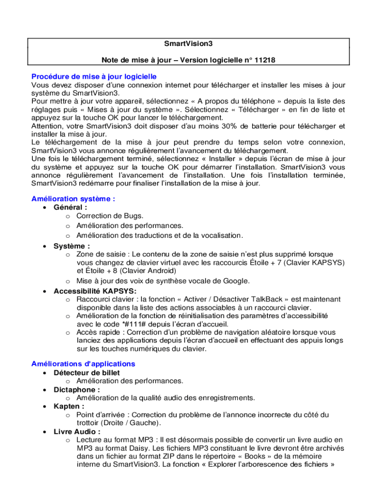 La note de misejour Smartvision3 est un document officiel utilisé pour déclarer les mises à jour concernant une entreprise ou un individu, souvent lié à des obligations fiscales ou administratives.