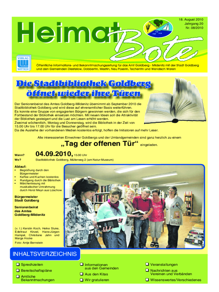 18. August 2010 Jahrgang 20 Nr. 08/2010Die Stadtbibliothek Goldberg ffnet wieder ihre Tren Der Seniorenbeirat des Amtes GoldbergMildenitz bernimmt ab September 2010 die Stadtbibliothek Goldberg und