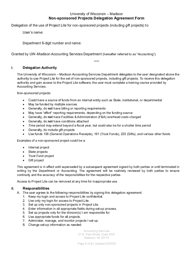 University of Wisconsin MadisonNonsponsored Projects Delegation Agreement Form Delegation of the use of Project Lite for nonsponsored projects (including gift projects) to Users name: Department 6digit
