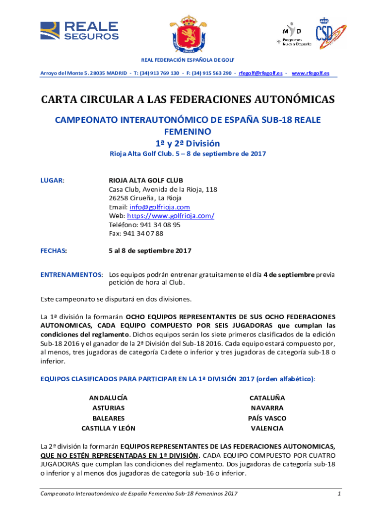 REAL FEDERACIN ESPAOLA DE GOLF Arroyo del Monte 5. 28035 MADRID T: (34) 913 769 130 F: (34) 915 563 290 rfegolf@rfegolf.es www.rfegolf.esCARTA CIRCULAR A LAS FEDERACIONES AUTONMICAS CAMPEONATO INTERAUTONMICO