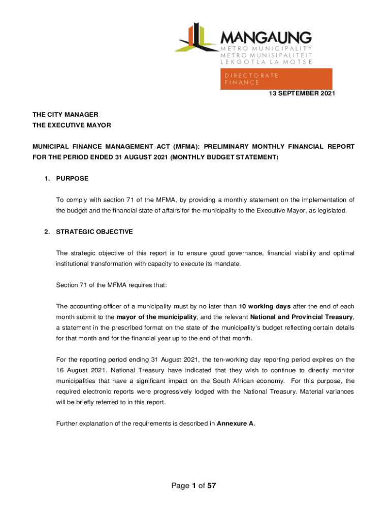 13 SEPTEMBER 2021THE CITY MANAGER THE EXECUTIVE MAYORMUNICIPAL FINANCE MANAGEMENT ACT (MFMA): PRELIMINARY MONTHLY FINANCIAL REPORT FOR THE PERIOD ENDED 31 AUGUST 2021 (MONTHLY BUDGET STATEMENT)1.