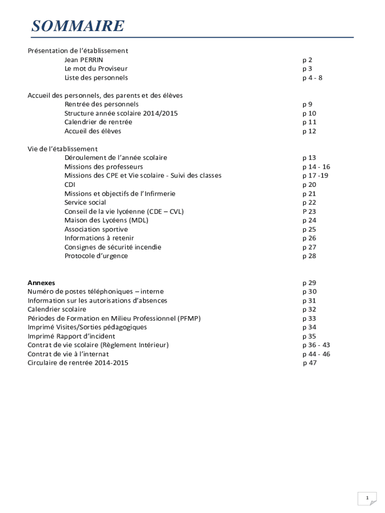 SOMMAIRE Prsentation de ltablissement Jean PERRIN Le mot du Proviseur Liste des personnelsp2 p3 p48Accueil des personnels, des parents et des lves Rentre des personnels Structure anne scolaire 2014/2015