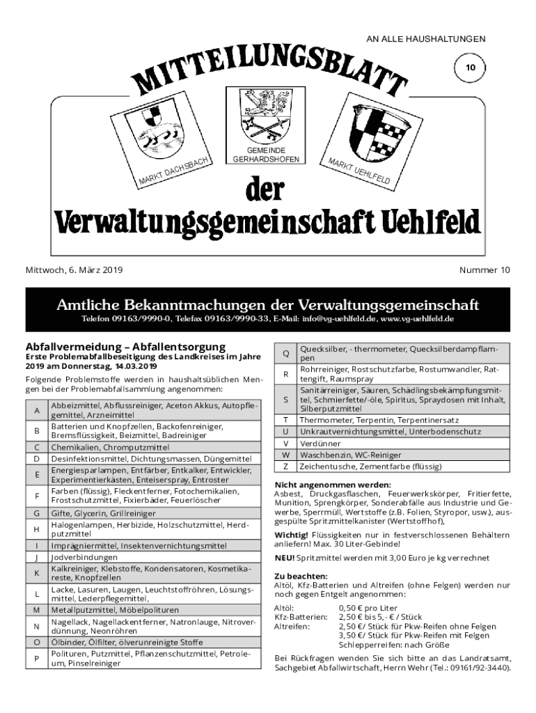 AN ALLE HAUSHALTUNGEN 10H BACT ARKMHS DACGEMEINDE GERHARDSHOFENMARKT UEHLFELDMittwoch, 6. Mrz 2019Nummer 10Amtliche Bekanntmachungen der Verwaltungsgemeinschaft Telefon 09163/99900, Telefax 09163/999033,