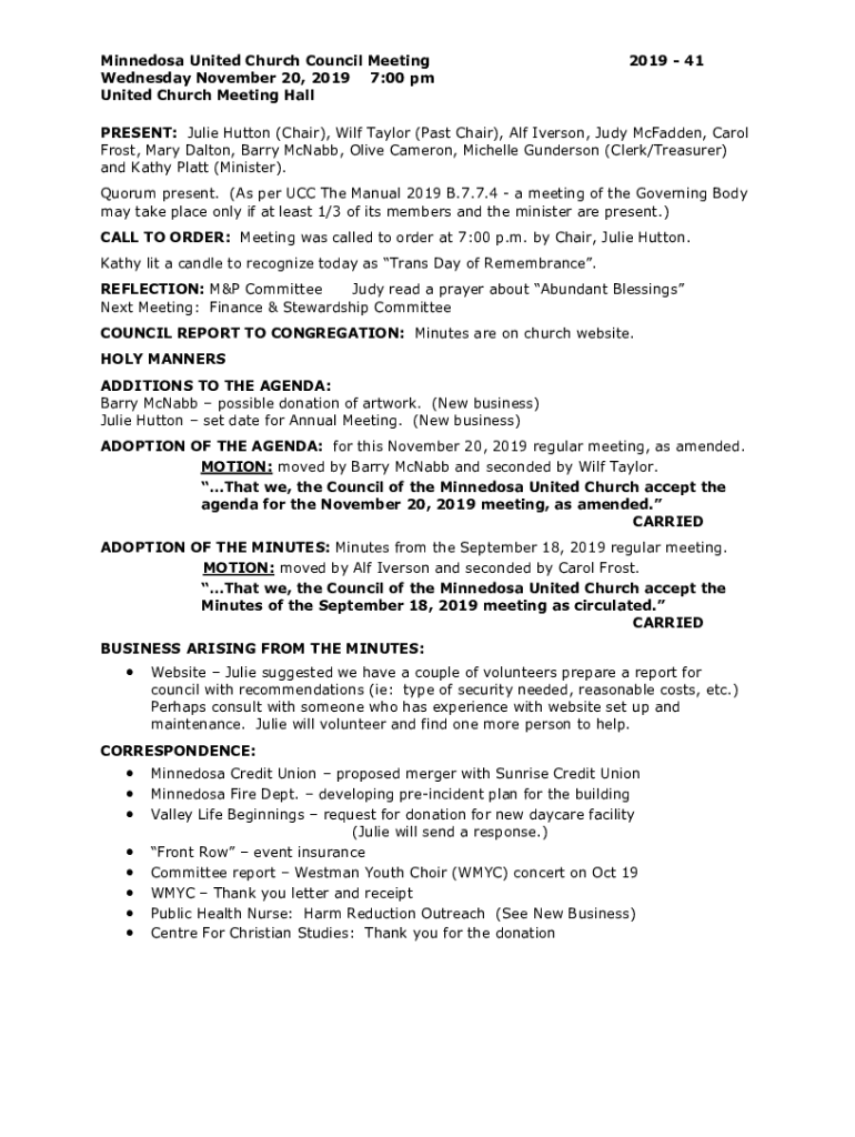 Minnedosa United Church Council Meeting Wednesday November 20, 2019 7:00 pm United Church Meeting Hall2019 41PRESENT: Julie Hutton (Chair), Wilf Taylor (Past Chair), Alf Iverson, Judy McFadden, Carol