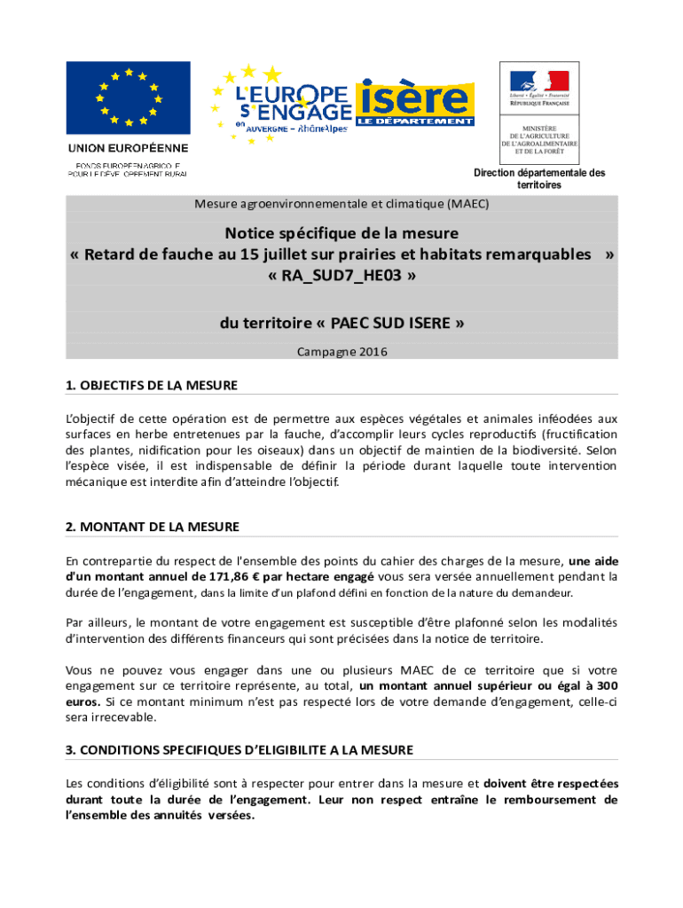 Direction dpartementale des territoiresMesure agroenvironnementale et climatique (MAEC)Notice spcifique de la mesure Retard de fauche au 15 juillet sur prairies et habitats remarquables RA_SUD7_HE03