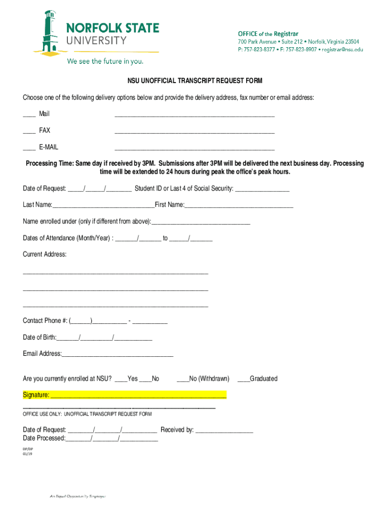 Email, fax, or share your nsu unofficial transcript request form via URL. You can also download, print, or export forms to your preferred cloud storage service.