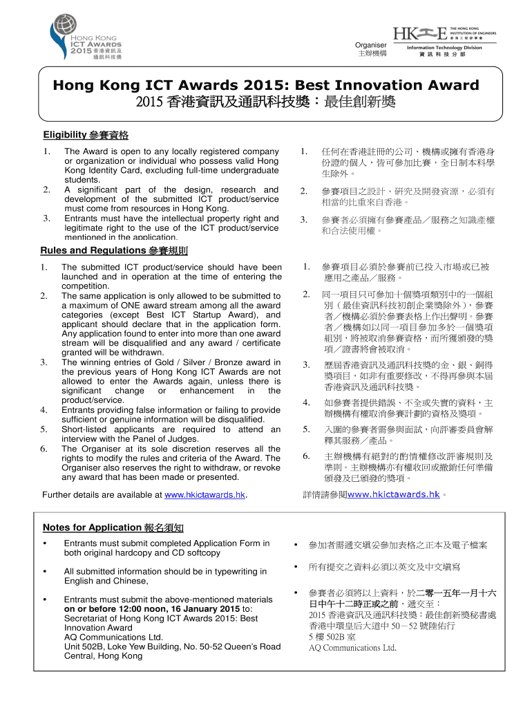 Organizer Hong Kong ICT Awards 2015: Best Innovation Award 2015 Eligibility 1. 3. 1. 2.