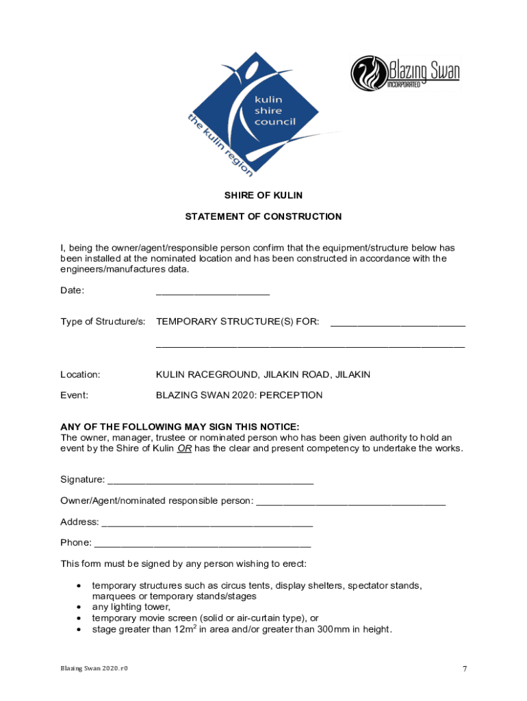 SHIRE OF KULIN STATEMENT OF CONSTRUCTION I, being the owner/agent/responsible person confirm that the equipment/structure below has been installed at the nominated location and has been constructed