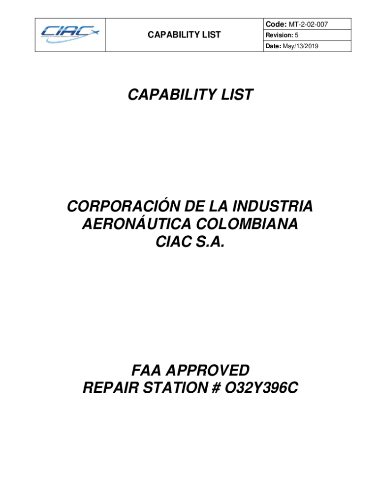 Date: May/13/2019CAPABILITY LISTCORPORACIN DE LA INDUSTRIAL