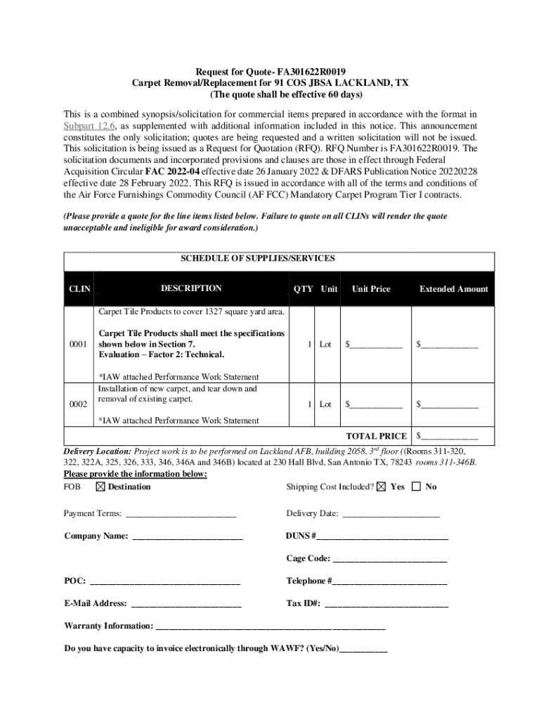 Get the free Request for Quote- FA301622R0019 Carpet Removal/ ...