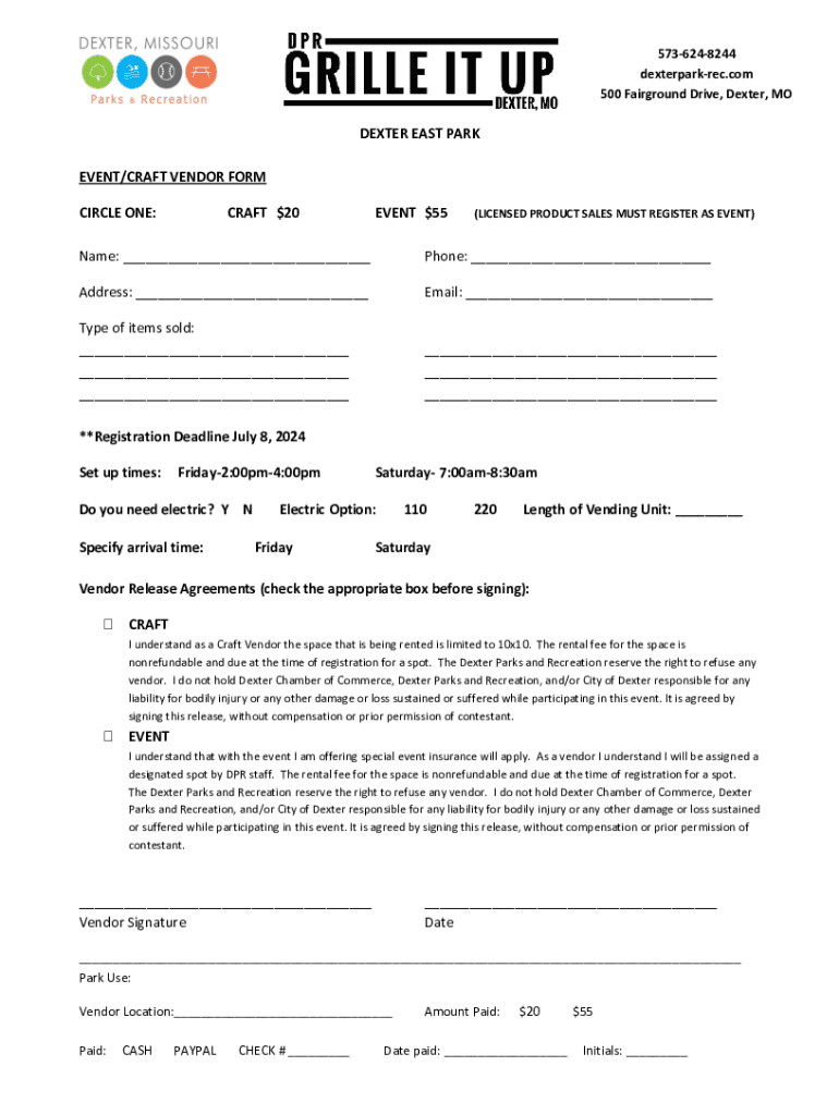 Email, fax, or share your dexter east park eventcraft form via URL. You can also download, print, or export forms to your preferred cloud storage service.