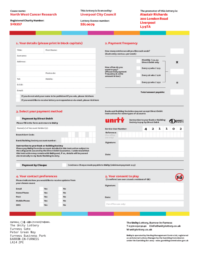 Cause name:This lottery is licensed by:Registered Charity Number:Lottery license number:North West Cancer Research