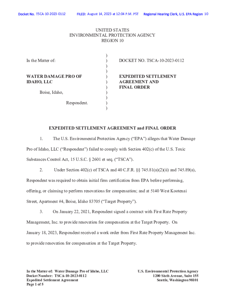 August 14, 2023 at 12:04 P.M. PSTTSCA1020230112UNITED STATES ENVIRONMENTAL PROTECTION AGENCY REGION 10In the Matter of: WATER DAMAGE PRO OF IDAHO, LLC Boise, Idaho, Respondent.) ) ) ) ) ) ) ) ) )