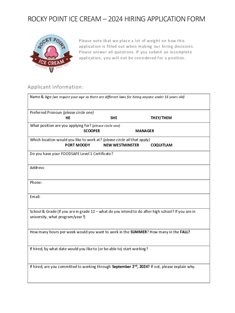 ROCKY POINT ICE CREAM 2024 HIRING APPLICATION FORM