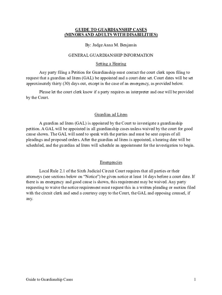 Email, fax, or share your guide to guardianship cases form via URL. You can also download, print, or export forms to your preferred cloud storage service.