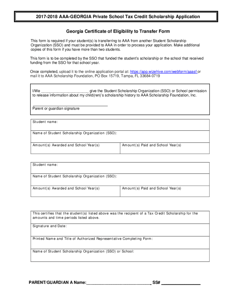 20172018 AAAGEORGIA Private School Tax Credit Scholarship Application Georgia Certificate of Eligibility to Transfer Form This form is required if your student(s) is transferring to AAA from another
