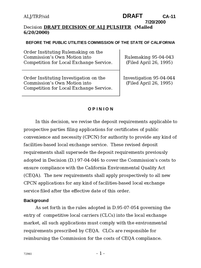 The Comments on Draft Decision -- CA.gov - docs cpuc ca is a document that can be filled-out and signed for certain purpose. Then, it is furnished to the actual addressee to provide some details of any kinds. The completion and signing may be done manually in hard copy or with an appropriate solution e. g. PDFfiller. These tools help to submit any PDF or Word file online. While doing that, you can customize it depending on your requirements and put a valid digital signature. Once finished, the user ought to send the Comments on Draft Decision -- CA.gov - docs cpuc ca to the respective recipient or several recipients by mail or fax. PDFfiller has a feature and options that make your Word form printable. It has a number of options for printing out appearance. It doesn't matter how you'll send a document - in hard copy or electronically - it will always look well-designed and clear. In order not to create a new editable template from the beginning every time, make the original Word file as a template. After that, you will have a rewritable sample.