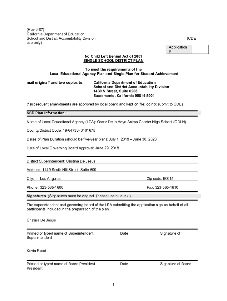 (Rev 307) California Department of Education School and District Accountability Division use only)(CDE Application #No Child Left Behind Act of 2001 SINGLE SCHOOL DISTRICT PLAN To meet the requirements