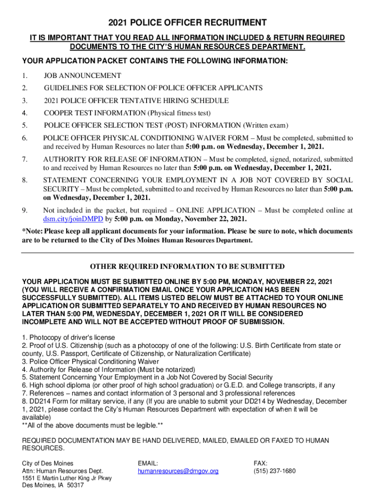 2021 POLICE OFFICER RECRUITMENT IT IS IMPORTANT THAT YOU READ ALL INFORMATION INCLUDED & RETURN REQUIRED DOCUMENTS TO THE CITYS HUMAN RESOURCES DEPARTMENT. YOUR APPLICATION PACKET CONTAINS THE FOLLOWING