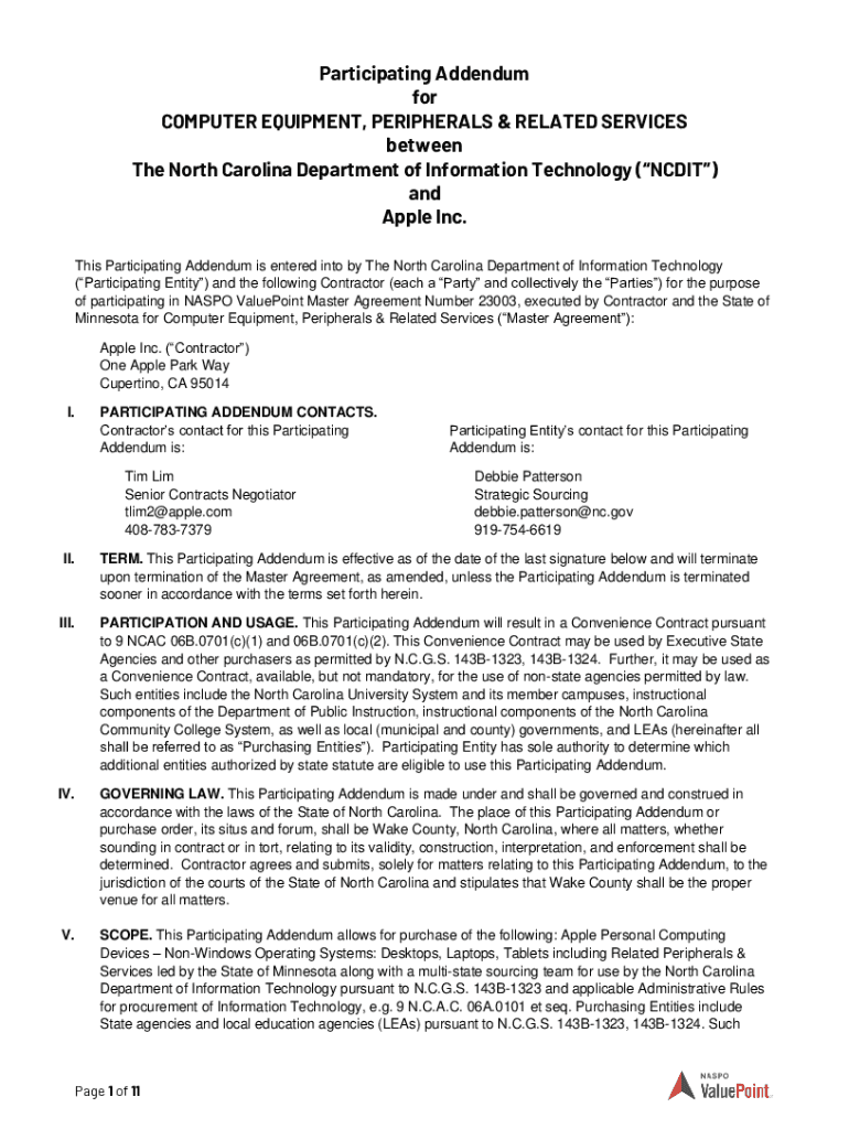 Participating Addendum for COMPUTER EQUIPMENT, PERIPHERALS & RELATED SERVICES between The North Carolina Department of Information Technology (AUDIT) and Apple Inc. This Participating Addendum is