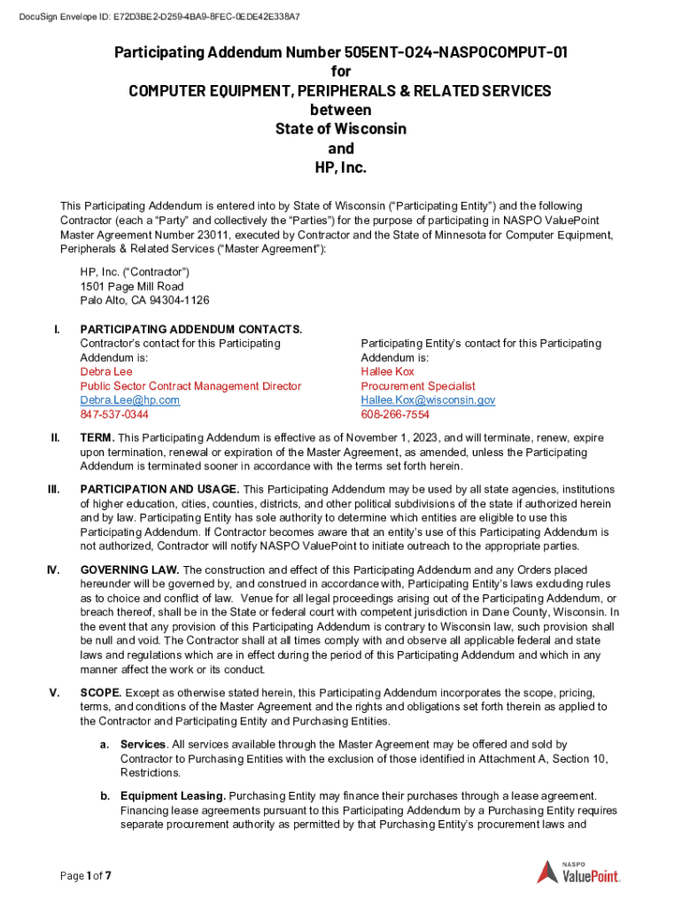 DocuSign Envelope ID: E72D3BE2D2594BA98FEC0EDE42E338A7Participating Addendum Number 505ENTO24NASPOCOMPUT01 for COMPUTER EQUIPMENT, PERIPHERALS & RELATED SERVICES between State of Wisconsin and HP,