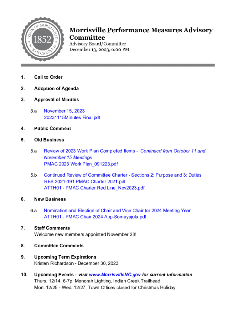 Mooresville Performance Measures Advisory Committee Advisory Board/Committee December 13, 2023, 6:00 PM1. Call to Order2. Adoption of Agenda3. Approval of Minutes 3.November 15, 2023 20231115Minutes