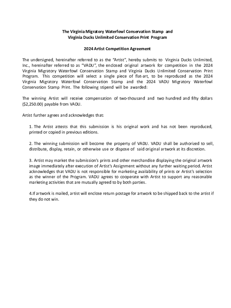 Get the free 2024 Virginia Migratory Waterfowl Conservation Stamp - Artist Competition Agreement
