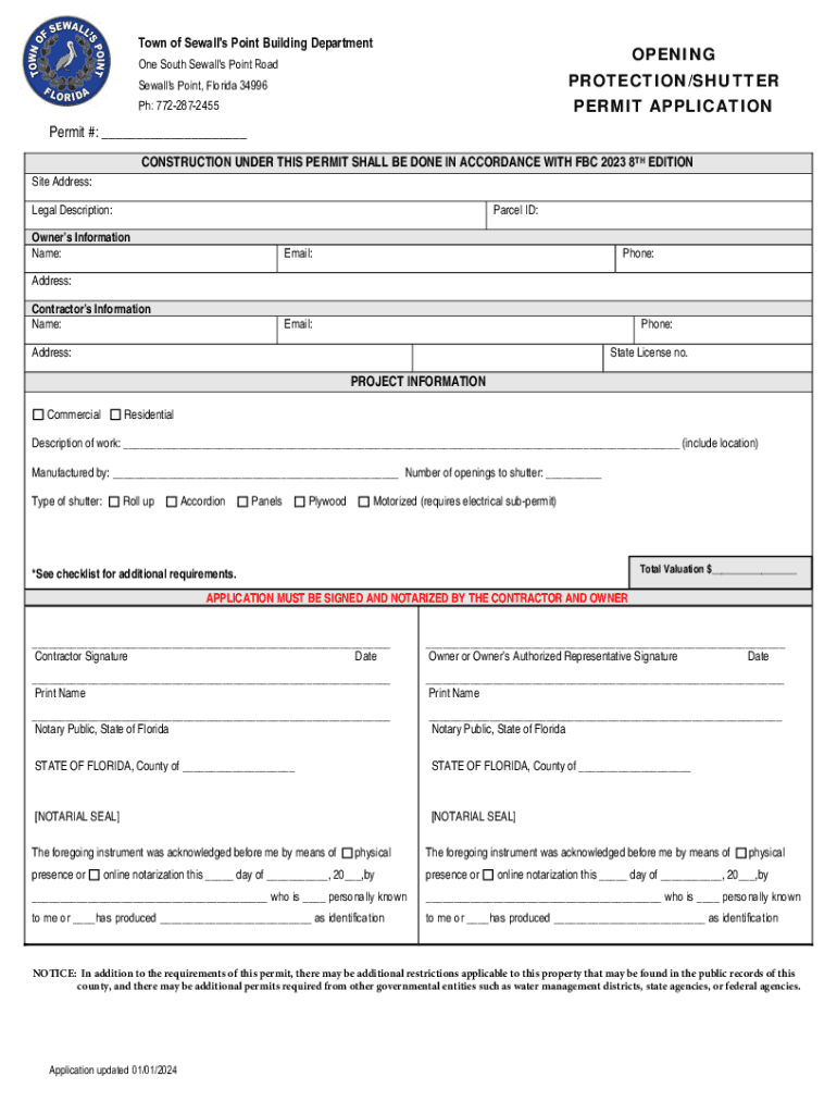 Town of Seawall\'s Point Building DepartmentOPENINGOne South Seawall\'s Point RoadPROTECTION/SHUTTERSewall\'s Point, Florida 34996PERMIT Application: 7722872455Permit #: ___