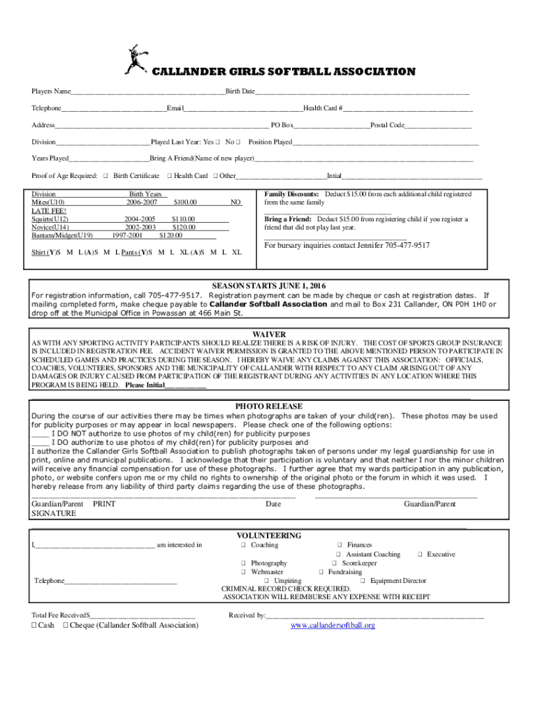 HOLLANDER GIRLS SOFTBALL ASSOCIATION Players Name___Birth Date___ Telephone___Email___Health Card #___ Address___ PO Box___Postal Code___ Division___Played Last Year: Yes No Position Played___Years