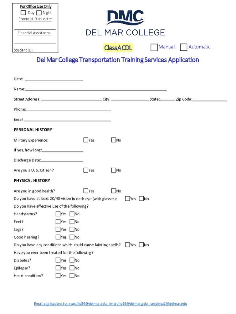 Financial Assistance:AutomaticManualClass A Student ID:Del Mar College Transportation Training Services Application