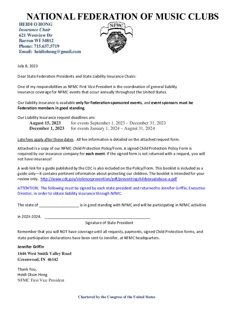 NATIONAL FEDERATION OF MUSIC CLUBS HEIDI O HONG Insurance Chair 621 West view Dr Barron WI 54812 Phone: 715.637.5719 Email: heidiohong@gmail.com July 8, 2023, Dear State Federation Presidents and